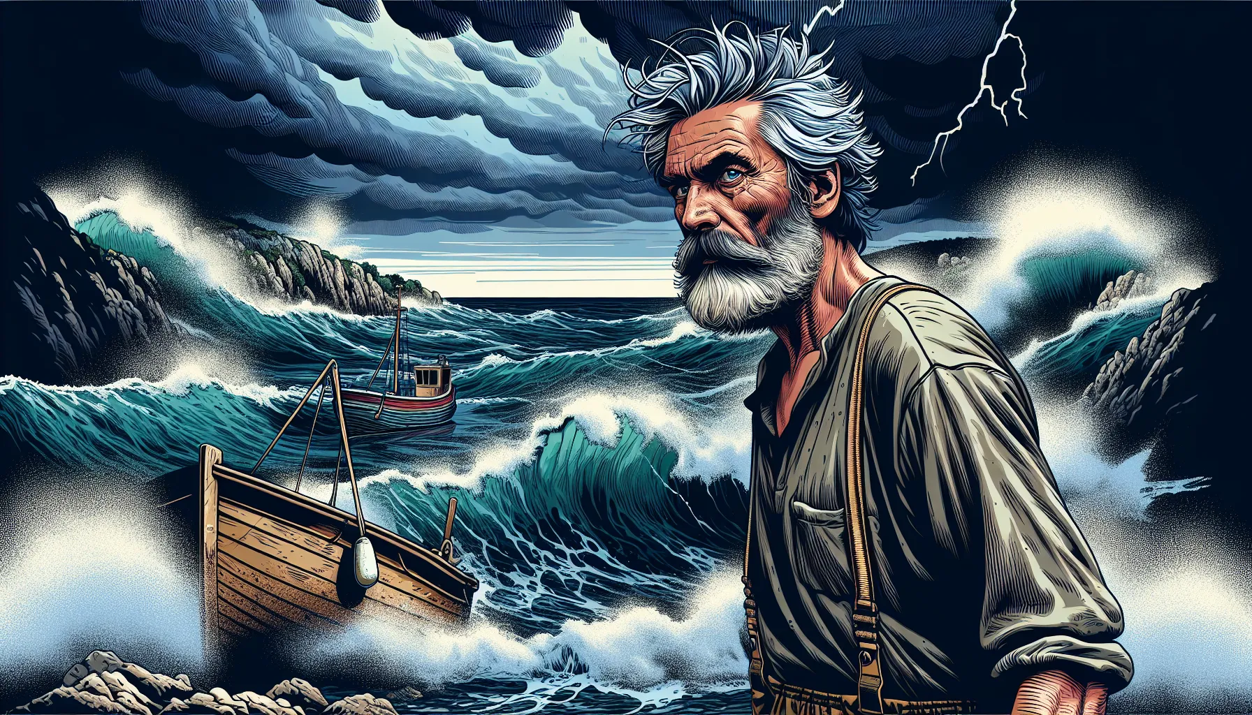 Priroda postaje glavna antagonistka kad se more počinje ponašati nepredvidivo. Kovačić majstorski gradi napetost kroz opis nadolazećeg nevremena – vjetar se pojačava, valovi postaju veći, a nebo se zamračuje na način koji svaki iskusni ribar prepoznaje kao znak opasnosti.